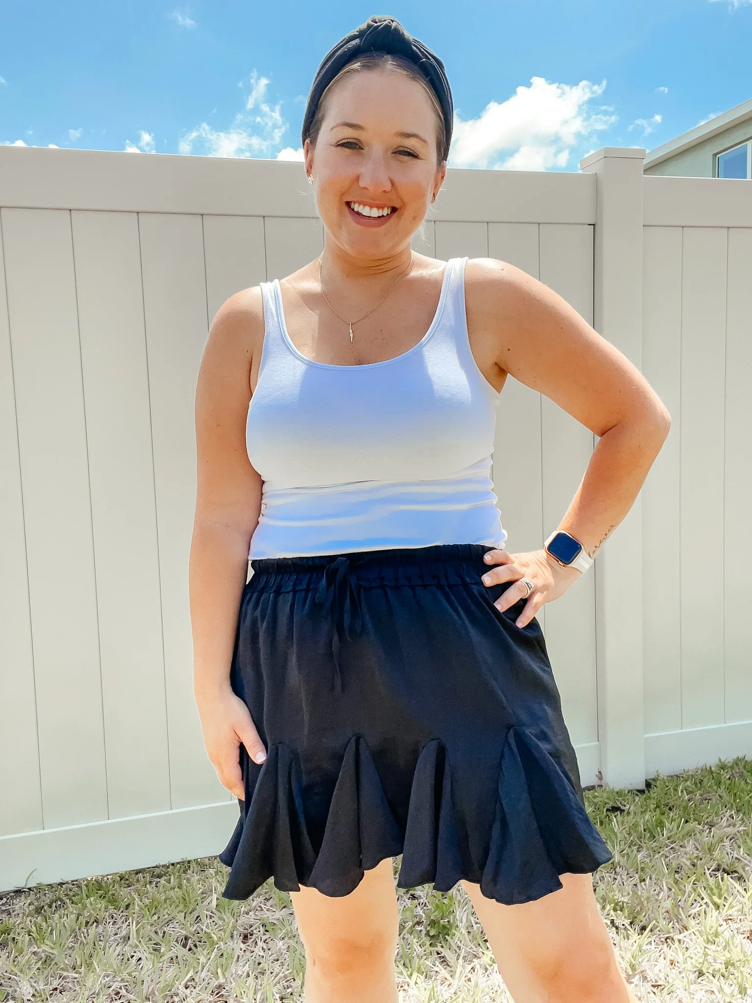A simple tank top and skirt are always an easy go to for me…and pulling my hair up is a must! Headbands make it look a little cuter and elevate the ponytail just enough for me!