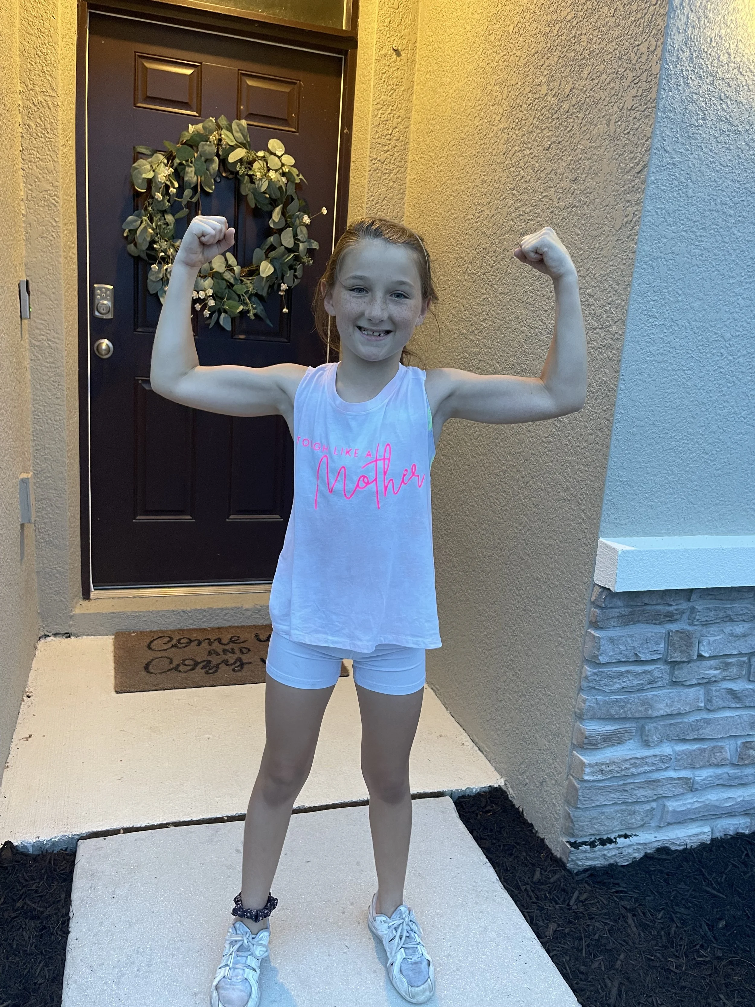 Speaking of girlies, this sweet girl wore my new shirt coming out on Monday to cheer last night and she was so excited. This one got damaged so I kept it and she asked for it. She is getting so strong from cheer’s spring training! Look at those arms!