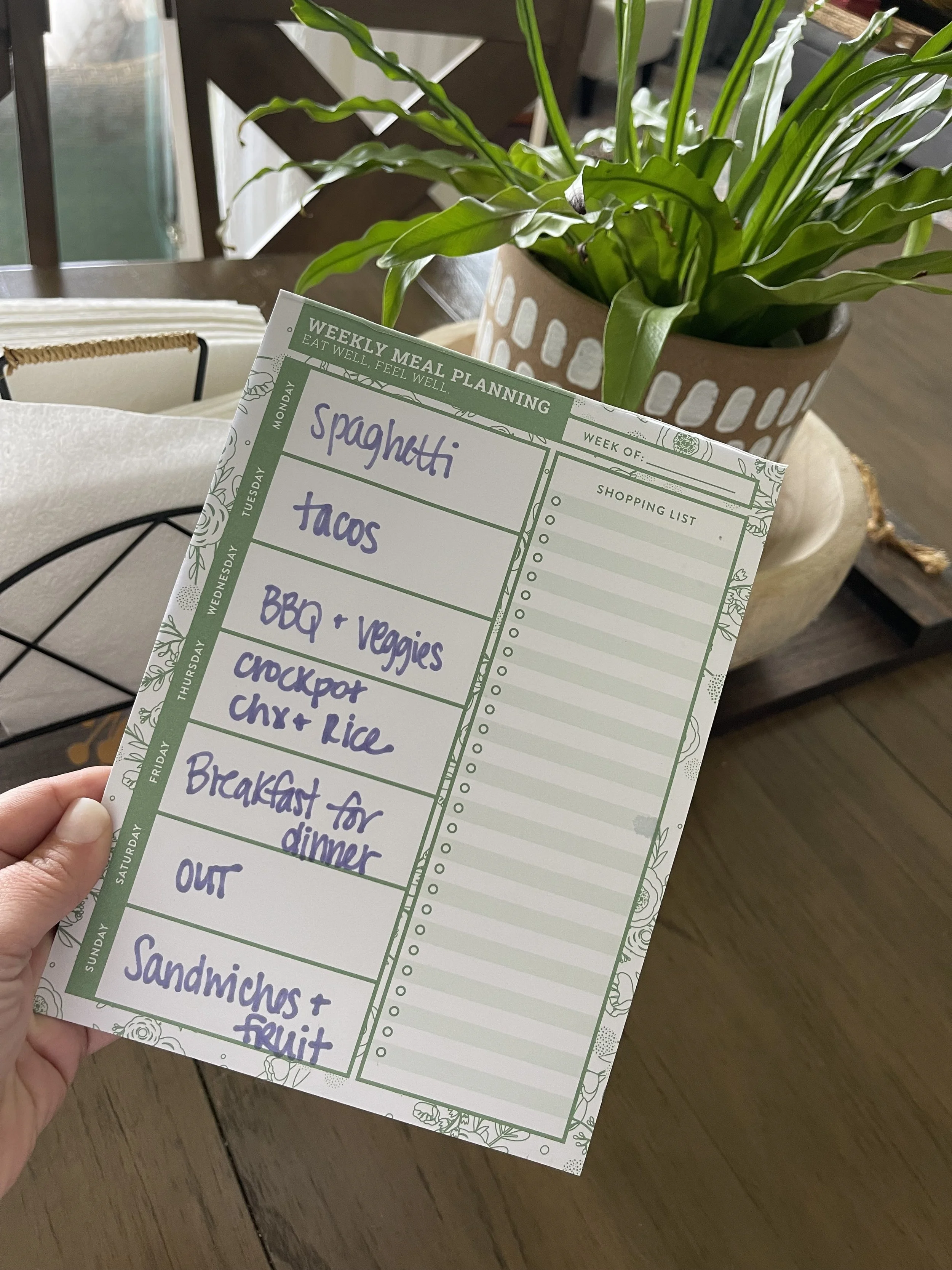 Be flexible! One thing I hated about meal planning in the beginning was feeling like I needed to eat Tacos on this night or hamburgers on that night if I didn’t want it. So, I create a list of meals but if I wake up and my family doesn’t want that I just pick something else on my list.