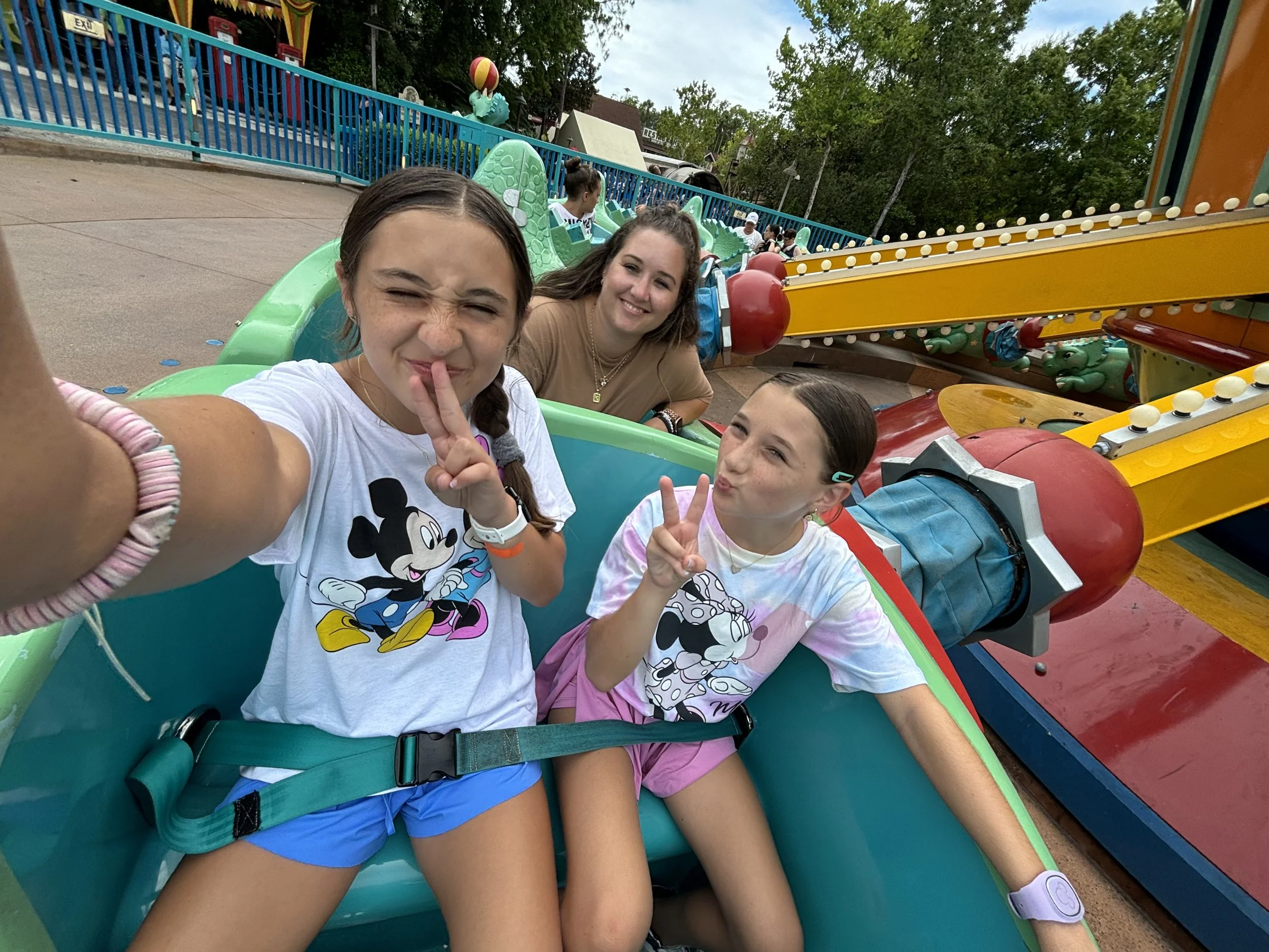 Paisley loves the Dumbo ride at Magic Kingdom so when she saw the Dino ride, she begged us to go on it. It was a 5 minute wait so we were in and ya’ll when it is blasting hot outside nothing feels better than the wind on a ride. These rides make me nervous, I don’t love heights and they messed with me all ride going up and down.