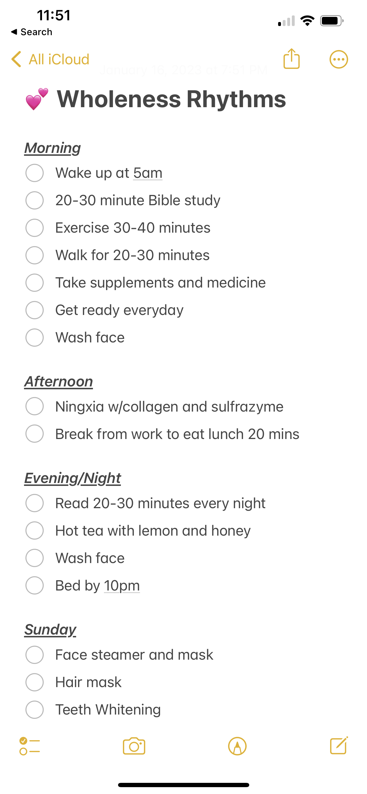 So, when I set my word for the year I decided to create some daily rhythms around the word that will help me be the best I can be physically, emotionally and spiritually. I made a note on my phone that I can check off each day when I do it and it has been working well so far. Right now as I establish the habits and rhythms I am trying to check off most of these each day and my hope is that soon I will consistently check them all off.