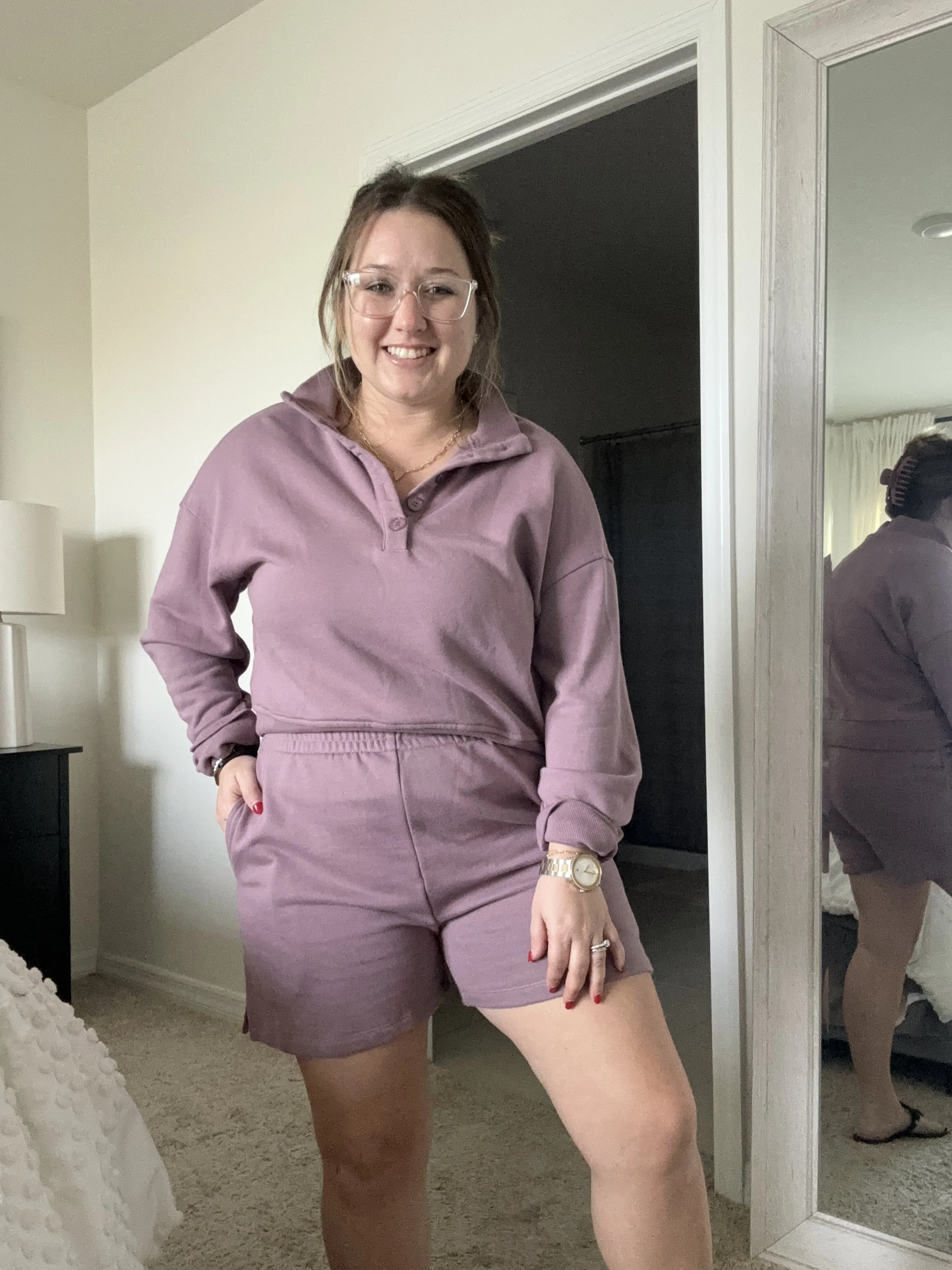I love that the matching elements automatically elevate the look and that it is shorts and a sweatshirt. This morning and this evening will be in the 50/60’s but we are supposed to have a high of nearly 80 today so I needed to be able to shed layers and this outfit knocked it out of the park.