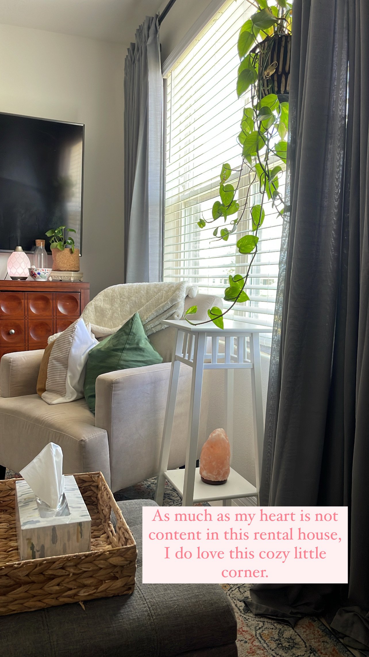 Yesterday I was sitting on the couch working and looked up and I was just so thankful for a cozy little spot in my house. It is no secret that I don’t love the rental we are in…its fine and I try to be grateful we found it in this crazy market but it doesn’t feel like home, its way too small for what we need and the neighborhood isn’t my favorite. Is that enough complaining? Ugh, sorry!