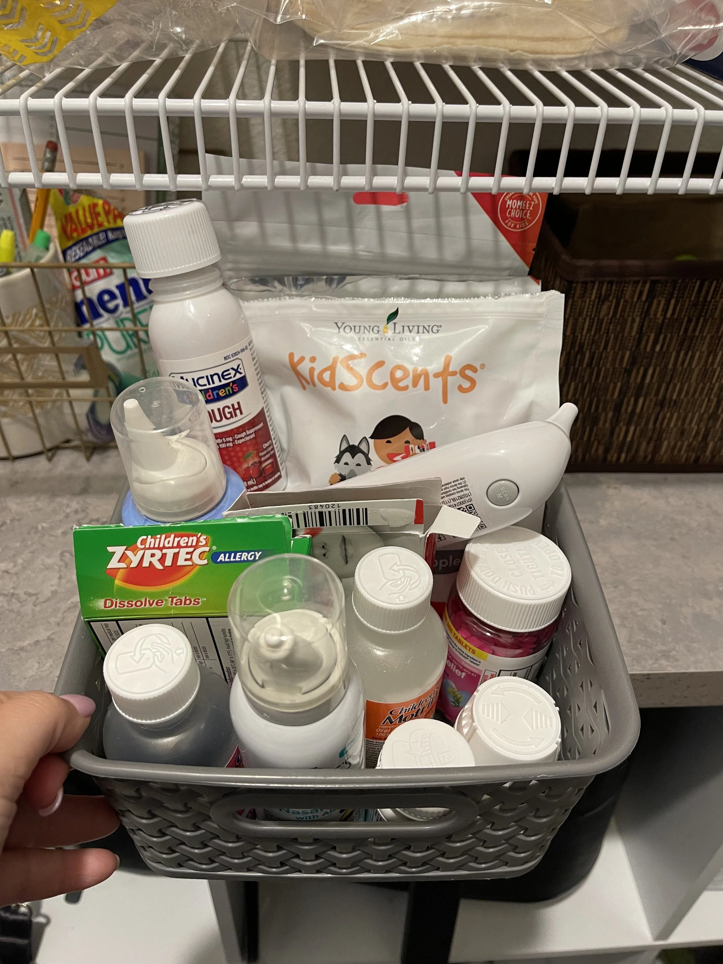 Also in the pantry I keep all the stuff we use weekly and/or daily (or need to grab quickly). This the kids probiotics, allergy medicine, Tylenol, bandaids, nasal spray (Paisley gets a lot of nose bleeds), etc. Keeping it in the pantry makes it easy to grab and accessible and is a reminder every morning as we are packing lunches that the kids need to take their supplements and allergy meds.