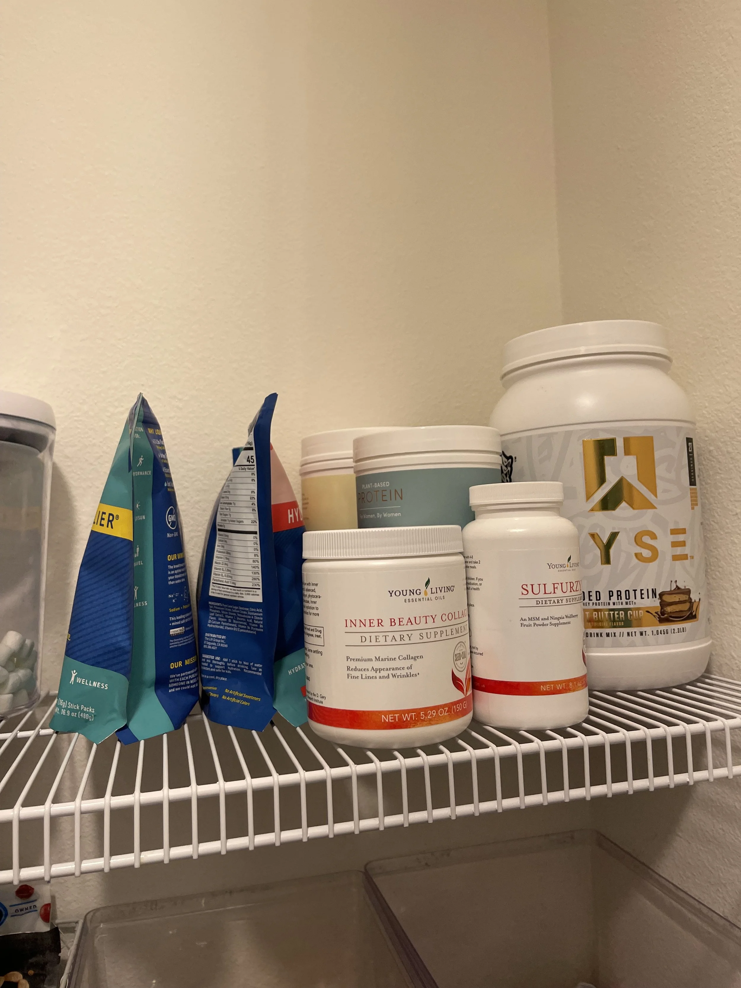 In the pantry I keep our collagen, protein, Liquid IV…usually we are putting these in smoothies so it just makes sense to have them in the pantry so they are easy to grab when we are pulling out the other smoothie ingredients.