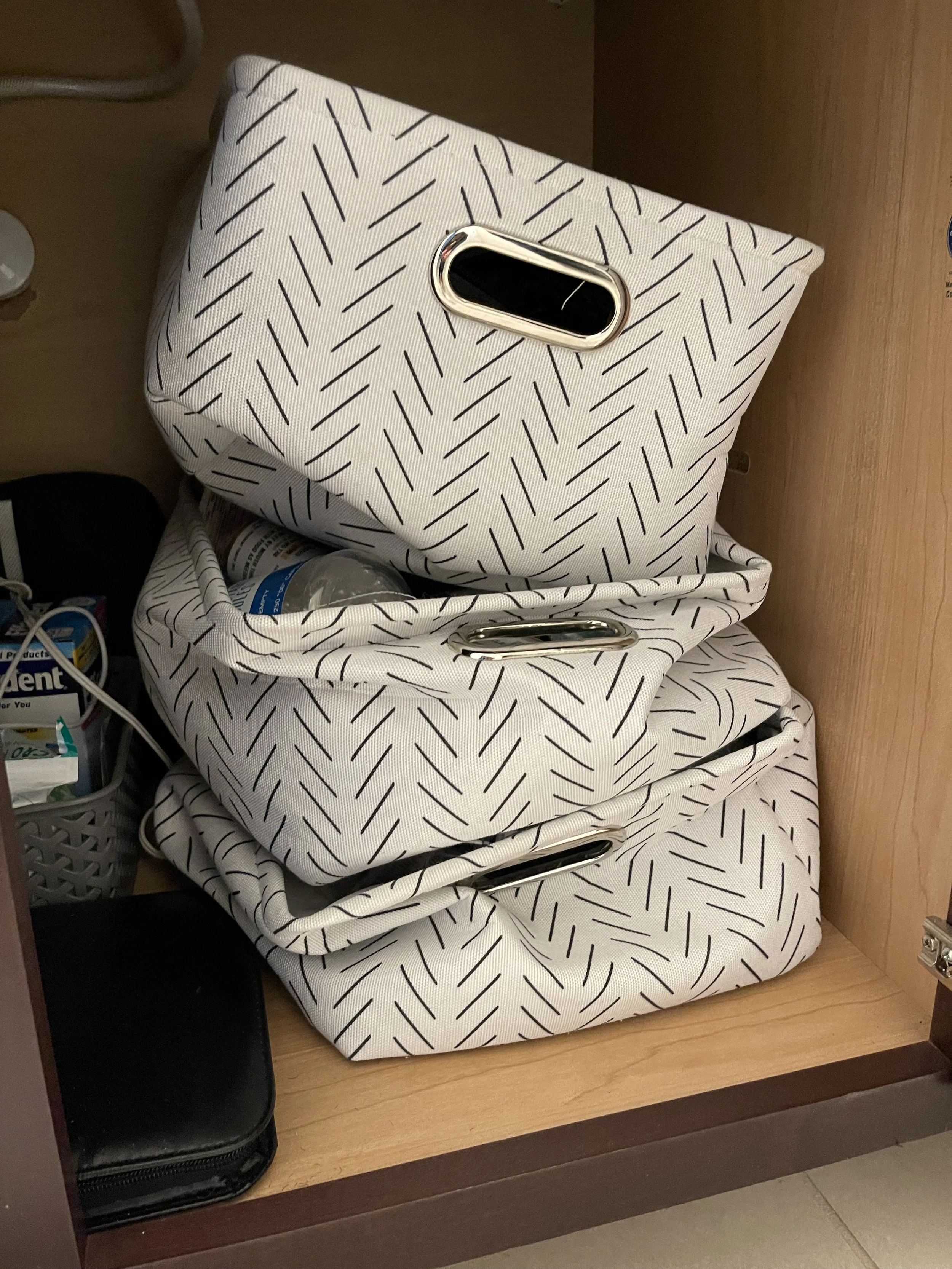 Under the primary bathroom sink we have 3 bins that store different things. This is overstock of stuff, extra thermometers, cough drops, nasal rinse…stuff that is bulky and not used often. Basically, I don’t want to look in these bins unless I have to because they drive me crazy 🤪 But, they work for now and store all the stuff we don’t need to grab for unless someone is really sick.