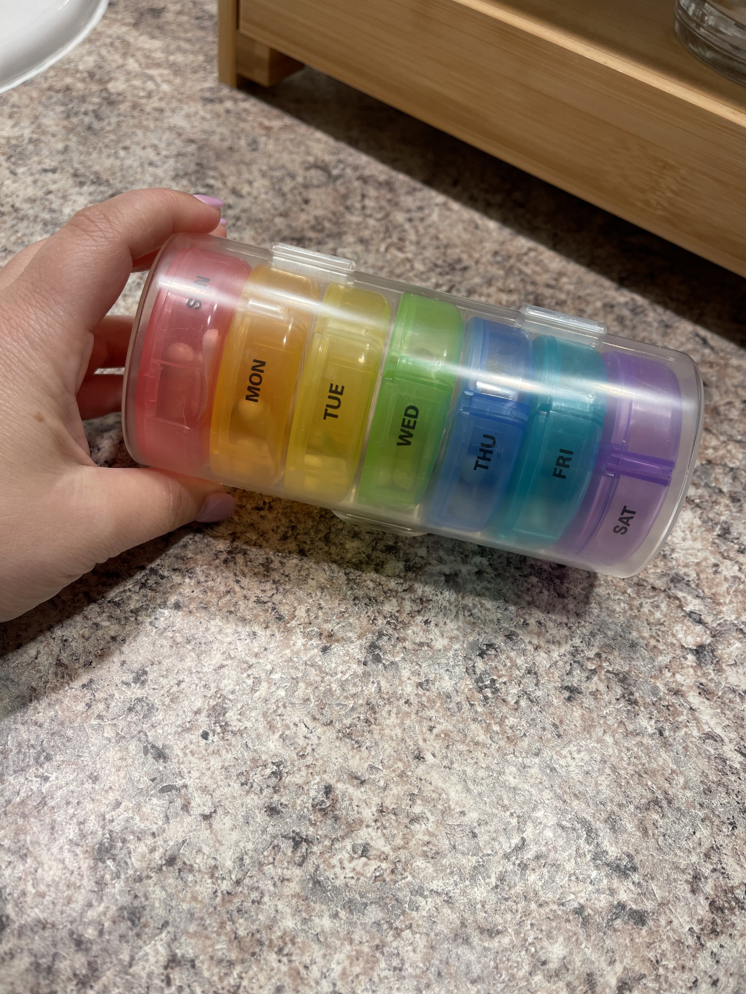Also in the bathroom on the counter I have my supplements. On Sunday’s I put them all in this little organizer so can easily and quickly take my AM/PM supplements and medication. All my larger bottles are stored and I bring them out weekly to reset the organizer. This helps keep the clutter off my counter but leaves them in eye sight so I don’t forget to take them