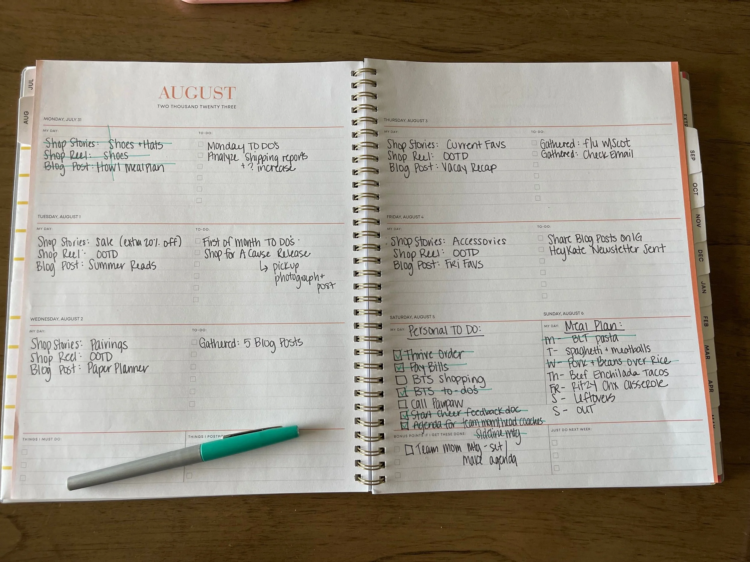 As you can see, I have our meal plans and both my personal to-do list and everything I need to do for business on there too. Again, it’s the last week of summer and the first week of cheer so my work schedule and to-do’s are light so we can prep for all the back to school stuff without a million other things on my plate.