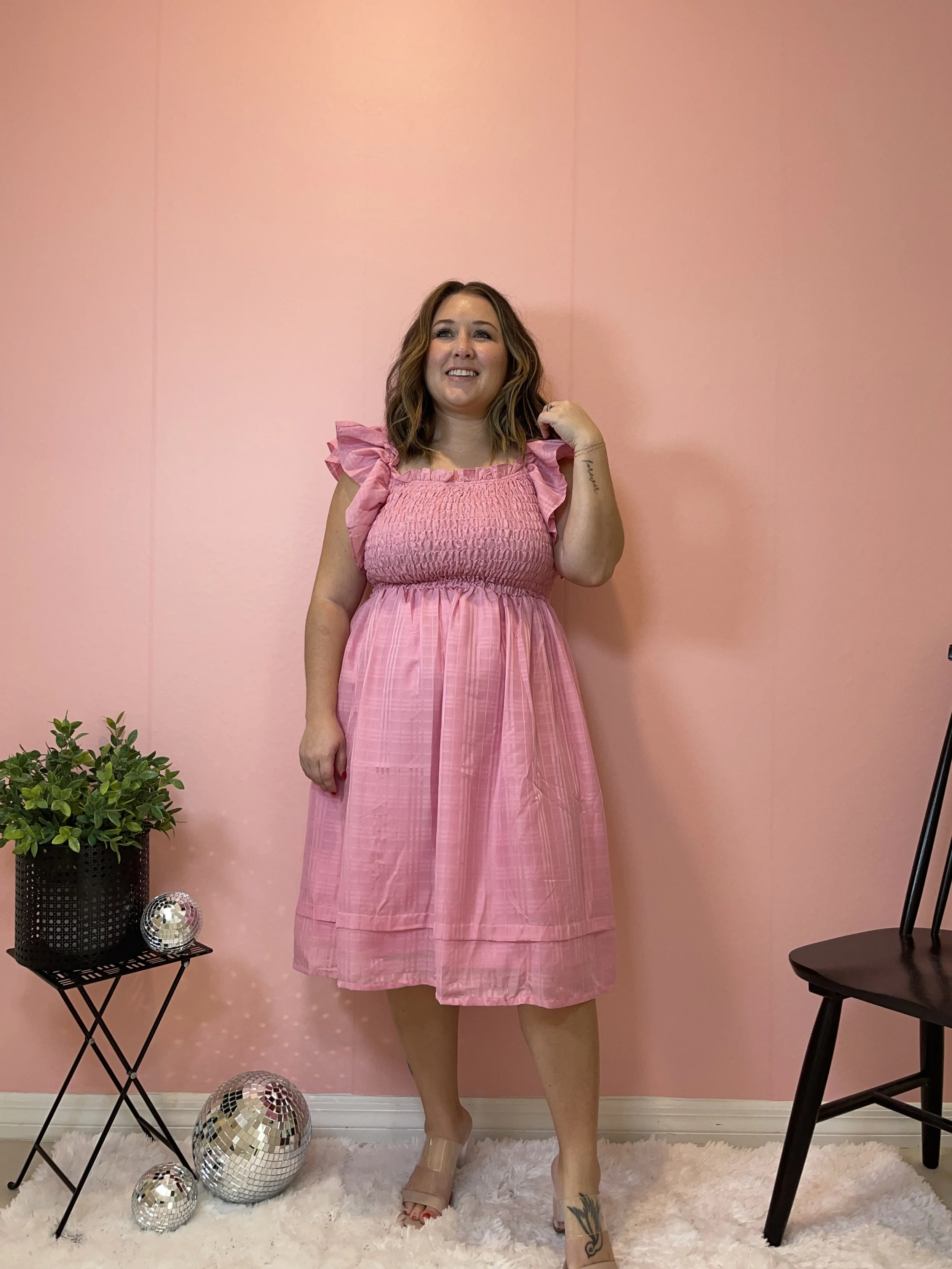 Last but not least, the cutest pink dress with ruffles to match! Not only is this cute for Valentine’s Day but is so cute all spring and summer long. It can be worn on and off the shoulder giving it two different looks and looks cute dressed up with heels like I have shown here or down with sandals or white sneakers would be so cute too!