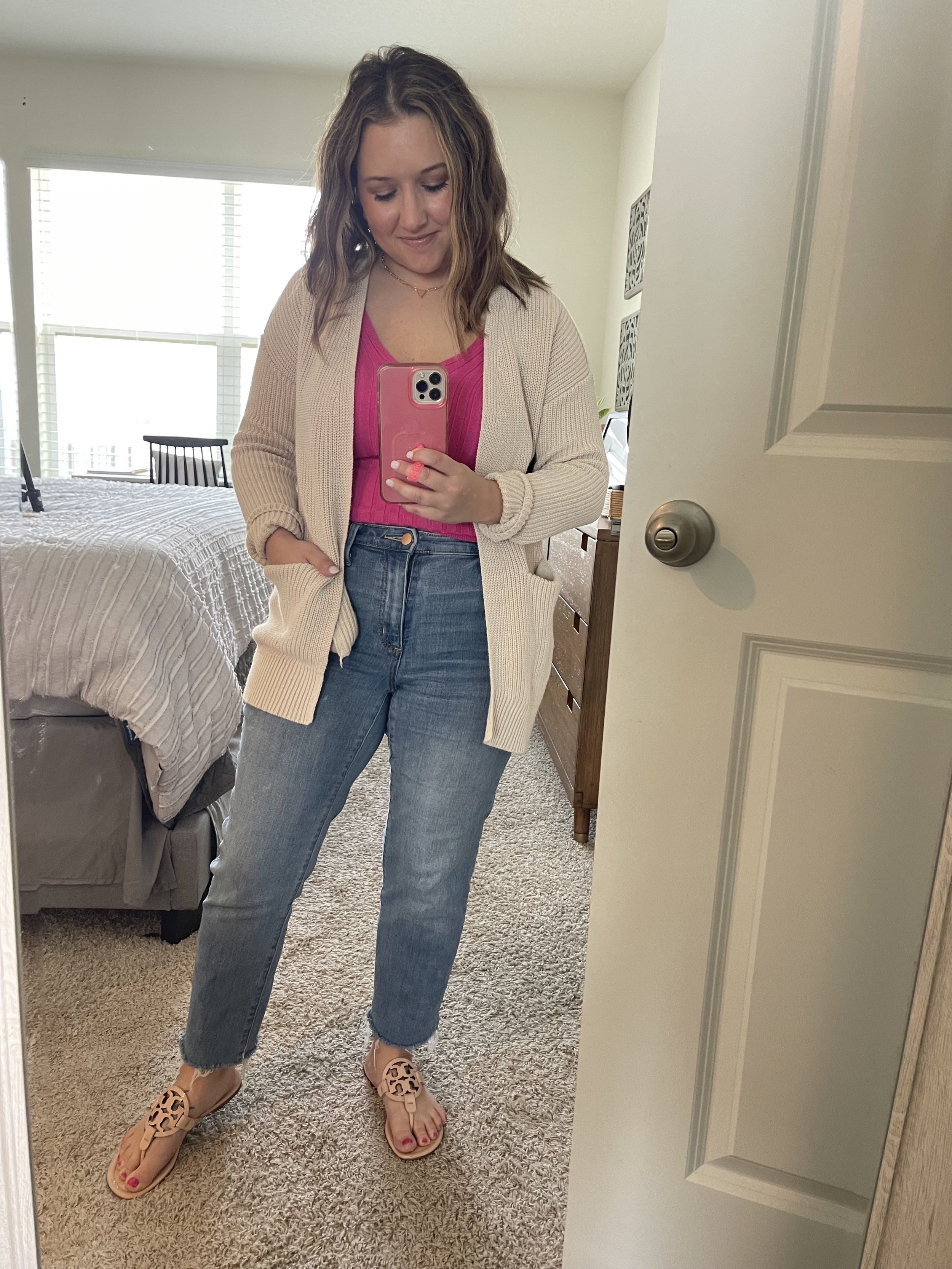 A fun new pink top always makes me happy! And we had a cold front come in so those sandals turned into sneakers and that cardigan was a must!